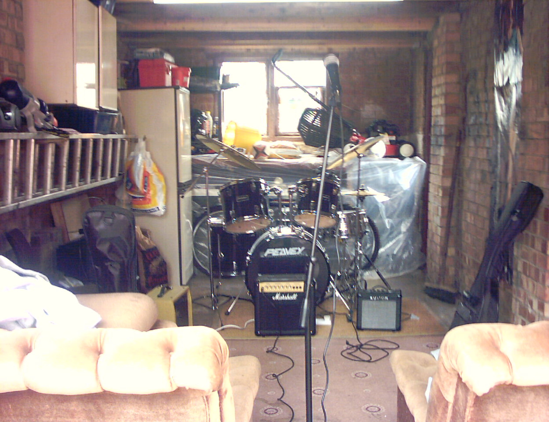 The garage is the home of Everyone Gets Laid. It's where we practise, hangout sometimes and where Luca goes to cry. In the garage we have a tv and vcr, a fridge freezer, two big chairs and other stuff.